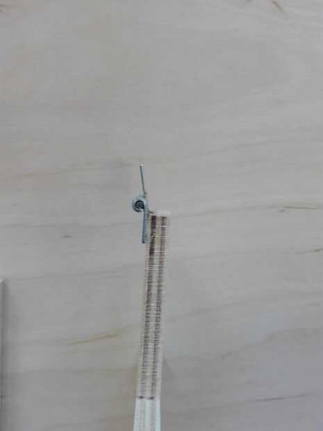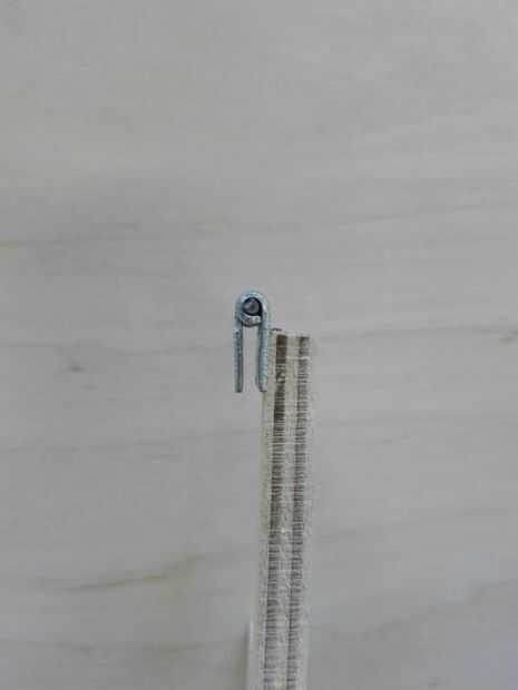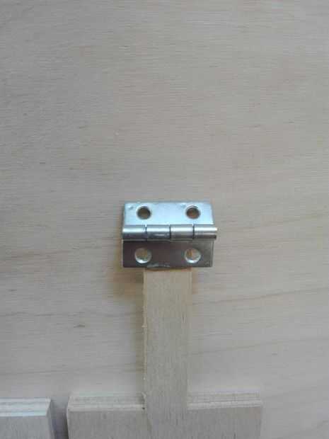 1. Pegue una pequeña bisagra centrada en la parte estrecha de la blanco (Fig. 1 y 2). Asegúrese de que el centro de los palos de la bisagra de la pieza de madera como se muestra en la foto 3 y 4.