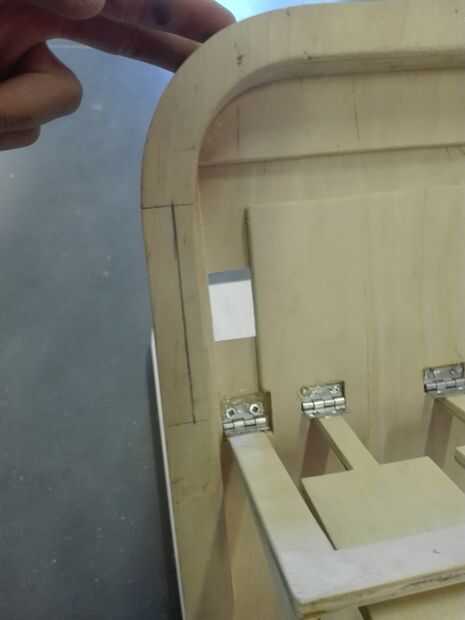 4. pegamento en las bisagras de los objetivos (Fig. 9 y 10) en los orificios cuadrados pequeños en la parte superior del tablero (Fig. 8). Como siempre, asegúrese de alinearlos correctamente al pegar.