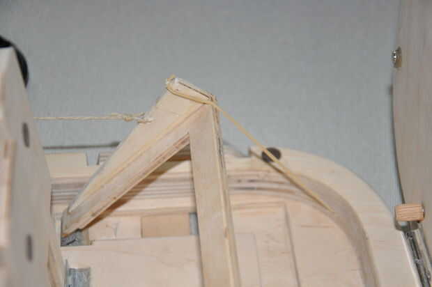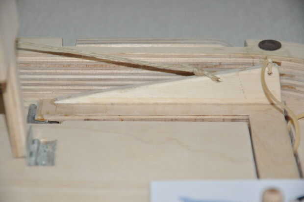 8. recorta un triángulo pequeño de 10 cm x 2 cm de madera contrachapada de 3 mm y pegar sobre el soporte en U con pegamento epoxi (Fig. 6). Luego perfore un agujero pequeño de 2 mm en la parte superior del triángulo (Fig. 6).