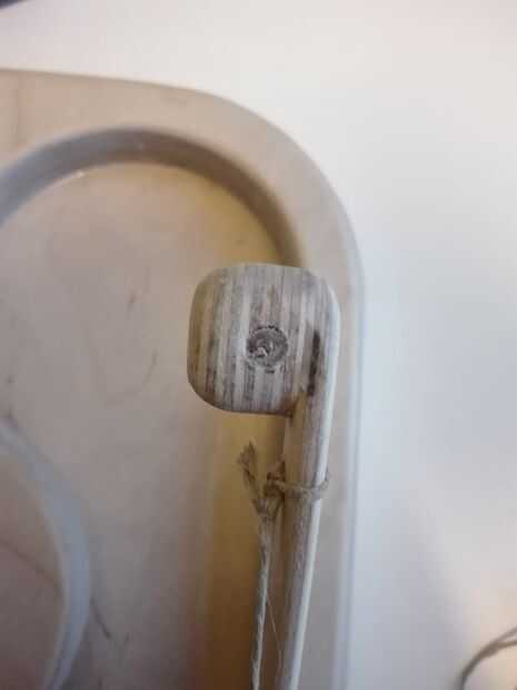 2. Pegue la plazoleta en el extremo de la tira de espesor de 3 mm y cantos (Fig. 1, 2 y 4). Se trata de la parte que se asegura de que el niño fácilmente puede agarrar la manija. Además, perfore un agujero pequeño de 2 mm en el centro de la franja de 3 m m gruesa justo debajo de la parte del mango grueso (Fig. 1).