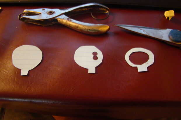 para hacer el aro, la corte de tarjeta más rígido. cortar el centro es complicado, pero tratar de perforar el agujero hacia fuera primero. Asegúrese de que es lo suficientemente grande como para permitir fácilmente el froggies pase a través.