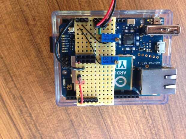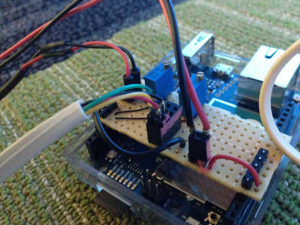 Se puede ver en la imagen que he creado un escudo Arduino DIY para este proyecto. Ciertamente no es necesario, pero sabía que montar y desmontar los componentes electrónicos para esto mientras nos trasladamos alrededor del edificio y fuera. Es un circuito simple de montar y tener el escudo que sea fácil de conectar y desconectar cuando sea necesario.
