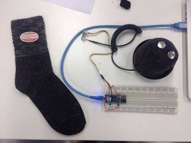Voltear los guantes del dedo de los sensores GSR adentro hacia fuera, para que el escritorio de metal más grande quede hacia afuera. Fijar los sensores en la parte superior de la taza del mentiroso (o cualquier taza que desea utilizar en el juego) usando una pistola de pegamento caliente. También al pie de un par de calcetines para cubrir los sensores de picado y utiliza pequeños agujeros para pegar los sensores fuera del 'Copa acogedor'. Habíamos probado diferentes formas de conectar los sensores, y al final del día, encontró que si hubo un poco de espacio entre las partes metálicas de los sensores y el plástico, las lecturas del sensor sería mejor. Material de la tela no afecta las lecturas de la GSR, pero hicieron de metal y plástico.