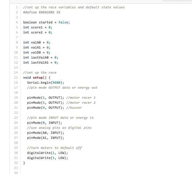 El código implementa las reglas del juego. Anima la carrera cuenta con la partitura e inicia una acción ganadora.