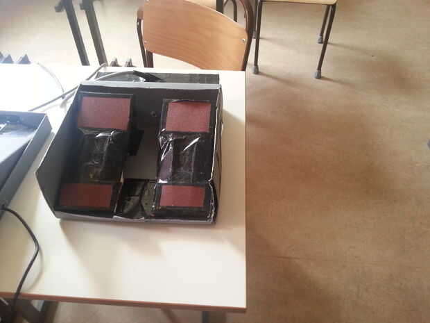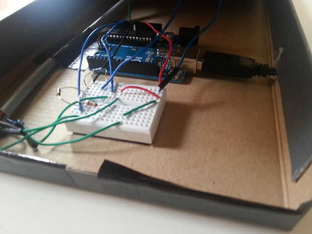 Mi amigo entonces construyó los pedales y el volante con cartón y cinta adhesiva. El Arduino y protoboard fue grabado a bajo el cartón. Tendrás que hacer alguna soldadura con los resistores sensibles de presión y un largo cable desde el volante los pedales.