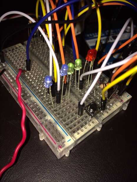 En este proyecto utilicé 6 LEDs (básicamente pequeñas bombillas) para proporcionar los efectos visuales del juego. Les arreglé rojo, rojo, verde, verde, azul, azul. LED, sin embargo, puede soplar Si está sobrecargados con energía. Como resultado, LEDs deban estar en consonancia con resistencias. En mi protoboard, di cada cable desde una salida de LED pin dos filas numeradas. Una es que la corriente entrante (J) al combinarse con una pierna de un resistor de 220 ohmios (I) (marcada en rojo, rojo, marrón). La segunda fila es para la otra pata de la resistencia (F de la fila siguiente) al combinarse con el alambre (J de esa misma fila) que luego va a la anode(long leg) del LED. El cathode(short leg) del LED entonces debe conectarse a tierra. Es ventajoso a la columna de tu protoboard etiquetado negativo a la tierra en su Arduino para que usted pueda utilizar para cada elemento del juego. Me gustó la estética de las seis resistencias paralelo y guardó mi tablero pequeño organizado. En el extremo con los LEDs actuales me pareció más fácil de poner todos los cátodos en una fila numerada (23) por lo que podrían compartir un terreno. Cada ánodo necesita su propia fila por lo que doblado los ánodos para llegar a cada una de las tres filas por encima de la fila de cátodo. No se ve gran unfiddled con pero con un poco de flexión más el LED puede estar en una línea perfecta. No puedo imaginar que mi arreglo es el más eficiente, pero el brillo resultante y el rendimiento de los LEDs fue aceptable y equilibrada.