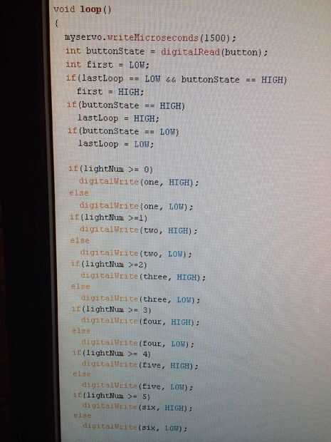 Para determinar cómo la lightNum afecta a los LEDs que escribí un sencillo sistema de if declaraciones. Si lightNum es > = el LED entonces se ilumina (por digitalWrite() llamada. Probablemente podría has utilizado una instrucción switch, pero decidí que dejaría reaprender para otro día.
