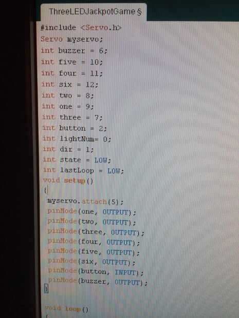 Determinar la entrada del usuario era algo complicado, pero interesante para mí. La codificación tiene en cuenta la posibilidad de que un jugador sólo podría sostener el botón de abajo para win(cheaters). Subsanar una variable llamada "lastLoop" de codificación que garantiza que el botón no se celebró. Si no vez había pulsado el botón durante la última va redondo entonces "lastLoop" = bajo. Lo contrario es alta. Por lo tanto, que si lastLoop es baja y buttonState es alta, entonces esta es la importante primera vez prensa y una prensa válido para ganar. Si es válido entonces una variable «primer» se asigna alta.