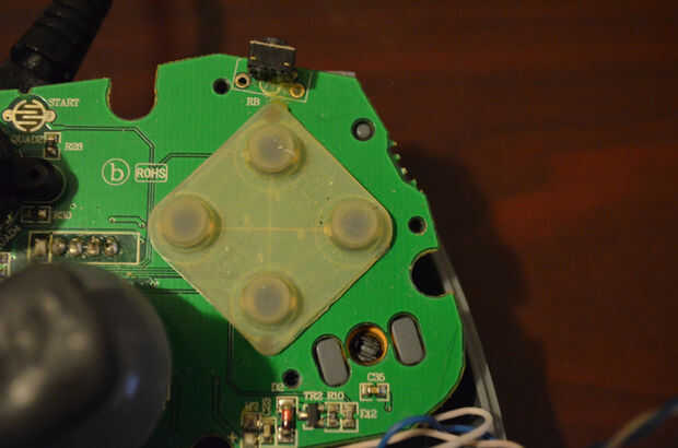 Efectivamente, en la parte inferior de la placa, justo más allá de donde la lleva desaparecido bajo el joystick, es un conglomerado de vias con huellas hacia el chip. No podemos estar 100% seguro que plomo haciendo estallar hacia fuera en la parte inferior se relaciona con los botones en la parte superior solo con mirar a ellos, por lo que tendremos que utilizar un probador de continuidad para determinar qué huellas pertenecen a qué botones.