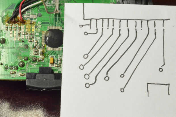 El positivo será un poco más difícil. Sólo habrá un camino desde el círculo de metal hacia el chip, y los rastros pueden ser algo laberíntico. En mi caso los rastros para los botones todos desaparecieron debajo de otro componente, haciendo imposible un rastreo visual. Afortunadamente eso no es absolutamente necesario.