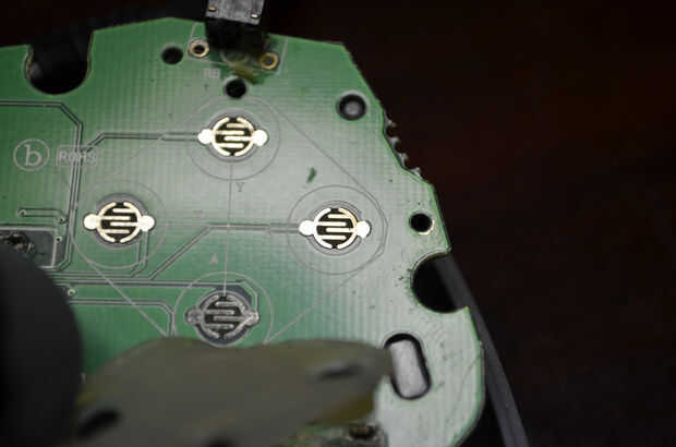 Los bancos del Consejo revela chip principal del controlador (enterrado bajo ese gran blob negro epoxi impenetrable), en que sabemos que los rastros de botón eventualmente deben terminar. Podemos Dile donde las huellas desaparecieron bajo la cubierta de la palanca de mando en la parte superior y buscar rastros provenientes de la parte superior a la parte inferior de esa zona y llevando a la viruta. Todos los rastros de los botones de esa mitad del controlador fueron todos lado a lado corriendo cuando desaparecieron bajo la palanca de mando, por lo que debemos esperar que exista una agrupación de seis vías en esa zona.