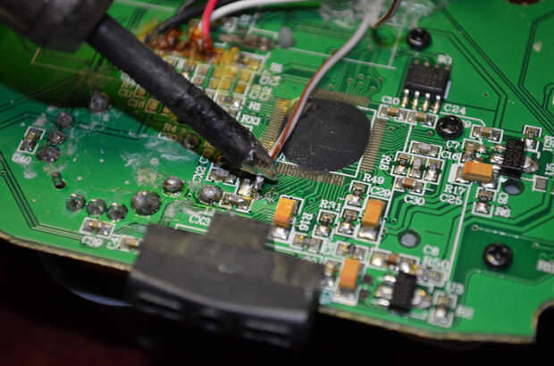 Una vez que has soldado el cable positivo, usted debe prevenir que salgan de lugar por pegar a la placa de circuito. Es un poco difícil de ver, pero en la foto he utilizado pegamento caliente para fijar el cable a la Junta. Hay realmente dos conductores en esa gota de pegamento ya que fui añadiendo una 'A' y un botón de 'B' para el controlador, pero levantó uno de fin de desorden no la imagen. Si desea agregar varios botones, es mejor hacerlo todo a la vez ya que se corre el riesgo de dañar viejo trabajo si guardar abrir el controlador, hurgando y tirones en los cables.