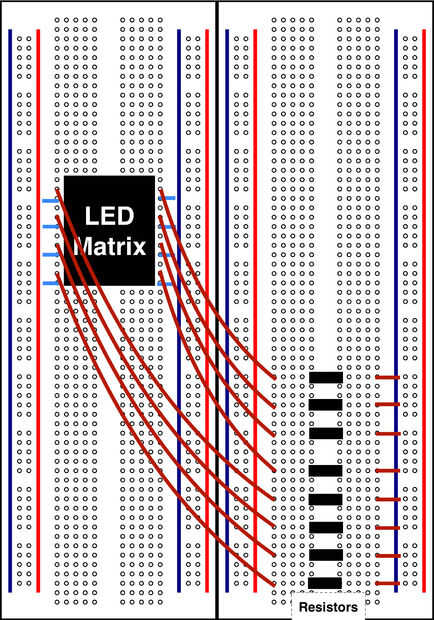 Ahora que usted comprende la matriz LED, ponerlo en el protoboard. Utilice los cables para cada fila y cada columna LED rojo. Necesita un resistor para cada LED en la matriz o columna. De la hoja de datos de matriz de LED, se calculó que necesita resistencias de 47 ohm. Poner estos resistores en la protoboard y conéctelos a las columnas de la matriz de LED. Utilice el diagrama de arriba como referencia. Los cables azules representan las filas y las columnas representan a los cables rojos. Una vez que haya terminado con este paso, usted debe tener 16 cables con su otro extremo no conectado a nada. Estos cables se conectan a los conectores Pmod que se describe en el siguiente paso.