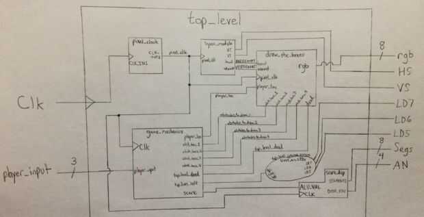 La parte final de este proyecto es el cableado de alto nivel. Hemos escrito ocho módulos independientes y tuvo que encontrar la manera de conectarlos todos juntos. Hemos comenzado con nuestra entidad top_level con entradas de Clk y player_input y salidas de rgb, HS, HV, LD7, LD6, LD5, segs y AN. El primer componente, game_logic, se implementa con clk y player_input como entradas. Hemos decidido p_i [2] que "up", el botón p_i [1] para ser "down" y el p_i [0] botón a "confirmar selección".