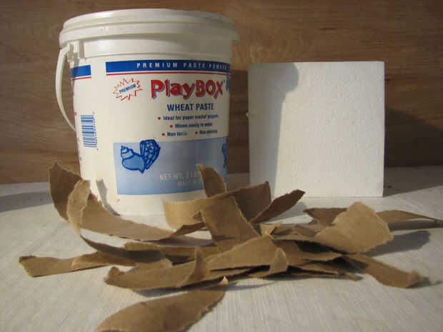 Cubos de espuma de cinco pulgadas hacen dados de gran peso ligero. Playbox papel maché mezcla de Blick tienda de arte es la mezcla más fácil más barata que he encontrado... Sólo tienes que seguir las instrucciones. Bolsas de papel marrón hacen una capa resistente. Dos capas deben ser abundante. Romper las bolsas de papel en tiras que son cerca de 1 pulgada por 3 pulgadas. Mejor de los trabajos de papel rasgado y corte con tijeras porque plumas bordes. El papel maché se aplica a una tira de papel en cada lado luego alise la tira en el cubo. Una vez que está todo cubierto dos veces, debe tomar un día para secar.