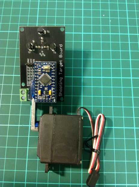 Usar la pistola de pegamento caliente para pegar la placa montada en el brazo del servo. Por favor, reserva algo de espacio entre el servo y el PCB. Como el servo del chasis pueden chocar con la placa durante el momento del brazo de servo.