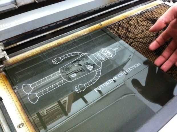 Para la capa superior que esta trabajada para recortar los límites del proyecto, perfore los orificios y cortar y grabar las piezas del juego y etch Bender a sí mismo en el acrílico.