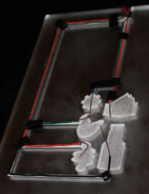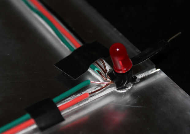 colocar los cables en las trincheras de tablero inferior. Cada agujero tiene un alambre que se extiende desde él al LED. Algunos cinta aislante puede sostener los alambres en lugar mientras trabajan, pero saca antes de sellar las juntas juntos. en los agujeros del tablero de juego, dejar 2cm de cable pelado que luego se doblará para garantizar el contacto con el aluminio lados hoja.