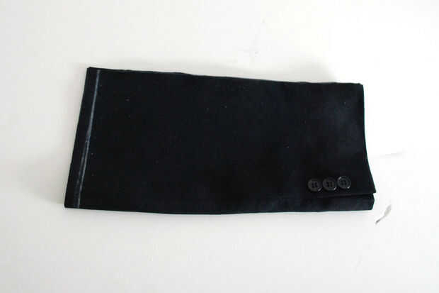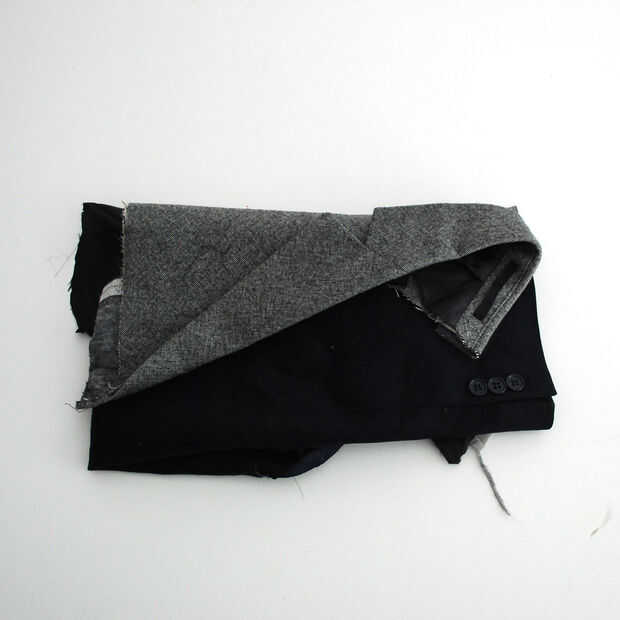 Jugué con las piezas y doblar en diferentes formas para tener una idea de cómo el embrague podría parecer hasta que encontré una posición y tamaño a mi gusto. (Había limitado solamente opciones como la parte del pecho (un pedazo sobrante de otro proyecto) era bastante pequeña y por lo tanto determina el tamaño del embrague.)