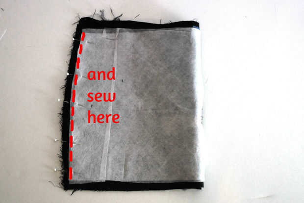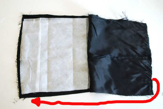 Entonces doblé la entretela debajo de la tela exterior (para el lado derecho de la guarnición y el lado derecho de la tela exterior se enfrentarán. He intentado visualizar este paso con la flecha roja en la segunda foto...)