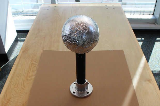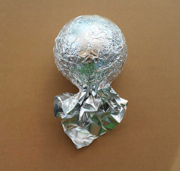 2. envolver la bola de espuma de poliestireno en papel de aluminio, dejando una "cola" de papel de aluminio. Coloque la bola en el soporte y empuje la cola del papel contra el interior de la tubería. Piezas pegamento caliente.