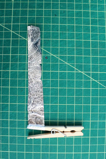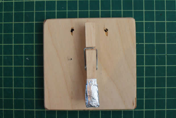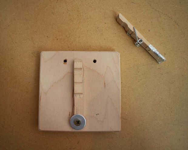 2. Quite la abrazadera del resorte pinza para la ropa, alinee el otro lado de la pinza sobre panel de madera y taladro tornillo + arandela.