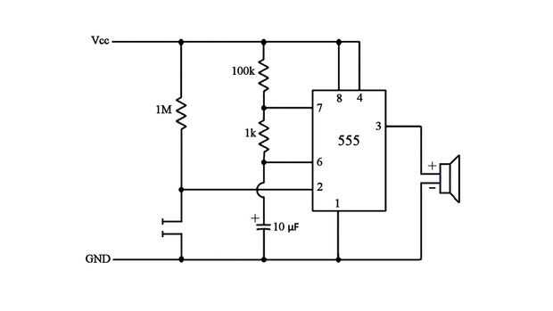 La salida del circuito está controlada por las tensiones en los pines 2 y 6. Las resistencias que se conectan a estos dos pines set inicial voltaje alto (áspero igual a la tensión de alimentación). Cuando agua rocía los conectores entre el pin 2 y tierra, el voltaje en el pin 2 gotas por debajo del umbral de referencia (1/3 de la tensión de alimentación). Esto provoca la salida en el pin 3 para ir alto y la alarma se enciende durante unos segundos. Cuánto tiempo permanecerá el zumbador en está determinado por los valores de los condensadores y las resistencias conectadas al pin 6. Con los valores que he usado (se muestra en el diagrama de circuito), el timbre sonará durante unos 2 segundos. Aumentar los valores de la resistencia o el condensador, aumenta este tiempo. Disminución de estos valores se reducirá este tiempo.