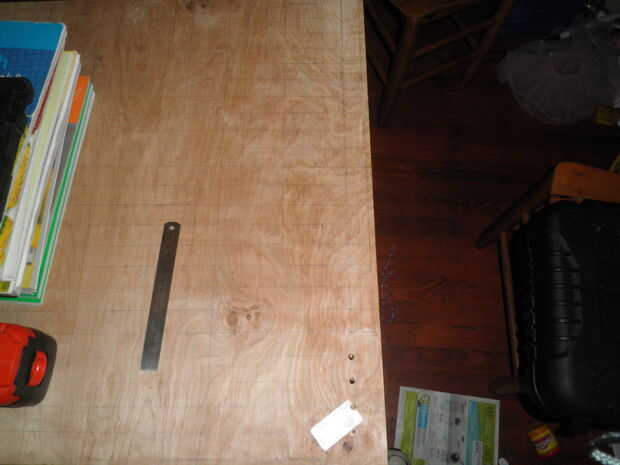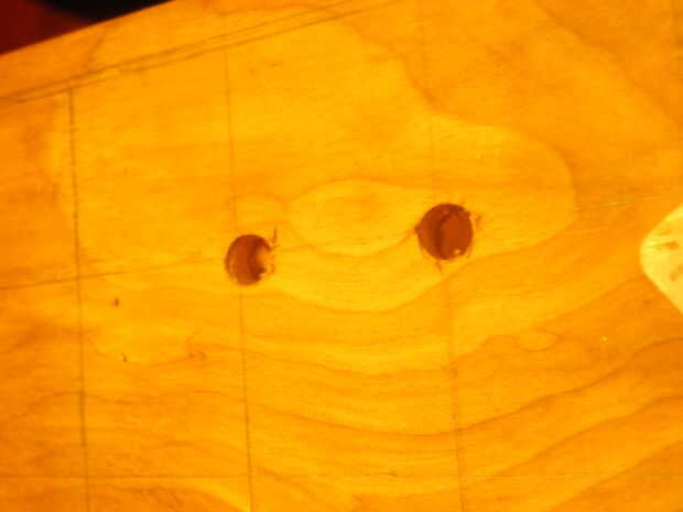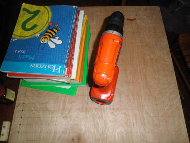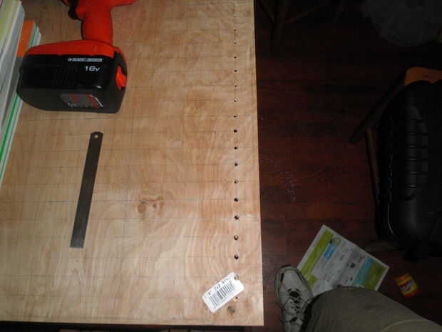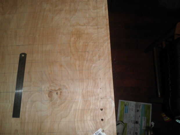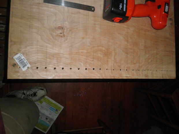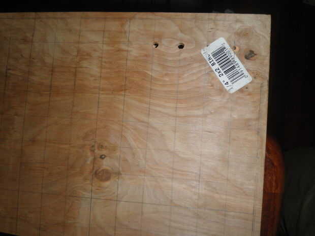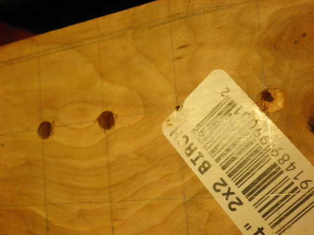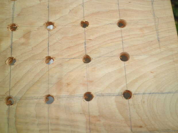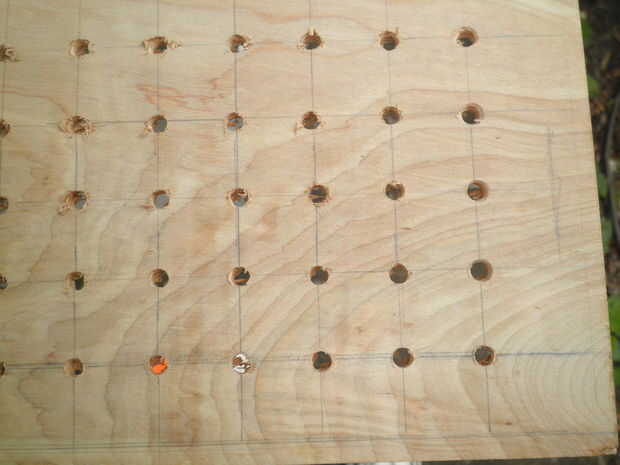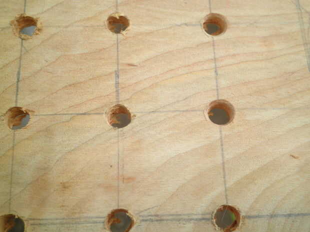 Ahora necesitará unos agujeros guía de taladro. Tomar la broca más pequeña, los más grandes tienden a saltar sobre y ruinas de todos que el tiempo que hacer esta cuadrícula agradable. Utilice el taladro con broca más pequeño un agujero en cada punto de intersección de las líneas de cuadrícula. Entonces usando la broca más grande del taladro hacia fuera lentamente. Si vas demasiado rápido, la madera se astilla y estropear la superficie del tablero. Para mantener la parte posterior de la Junta de fragmentación pone en un pedazo de madera que no te importa perforación agujeros en. Si usted no tiene que tendrá que vivir con la fragmentación en la parte posterior de la Junta.