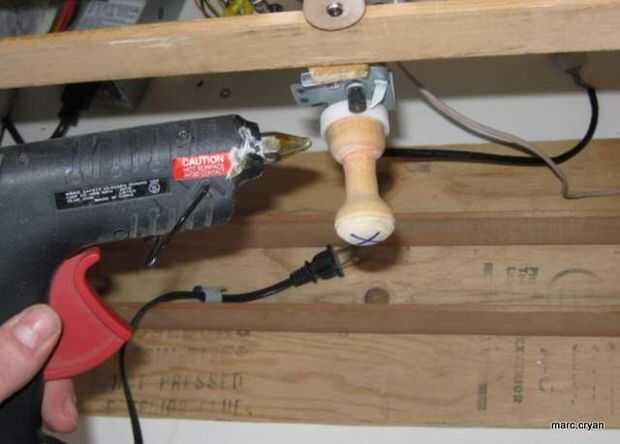 He utilizado pegamento caliente a agregado el huso de madera para el engranaje plástico. Aplicado el pegamento a la parte inferior de la pieza de madera y luego jamed en el engranaje.