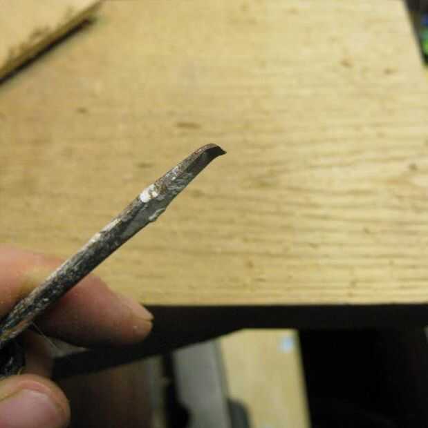 Nota: A veces es difícil llevar la pieza redonda a la sierra. Tengo dos trucos. Lubrique el interior de la sierra con un 'corte fácil'. Yo uso este bonito mucho cada vez que perforar o cortar cualquier cosa, porque hace todo más fácil y quiter (generalmente estoy trabajando en la noche). También tengo una herramienta que hice que se ajuste entre los dientes de la Sierra de modo que puede apalancar ou el enchufe. He hecho de un destornillador, pulido por los lados, doblando sobre la punta y luego afilar la punta. Esta herramienta también es useufl si están perforando un agujero en el yeso. Puede perforar parcialmente a través de la pared, dejando el enchufe en la pared, luego punta thie del conductor del srew modiefied del palillo en el agujero piloto y saque el enchufe. Esto es útil si usted está interesado en el agujero en vez de la clavija.