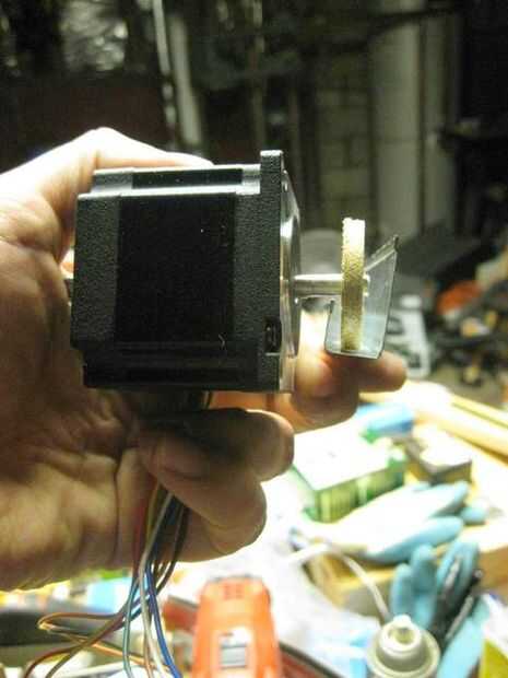 La sierra corta un círculo de diámetro de 1-1/2" con un orificio de 1/4" en el centro. Esto trabaja lo justo para mermelada en el eje de motor paso a paso y encaja en la corredera.