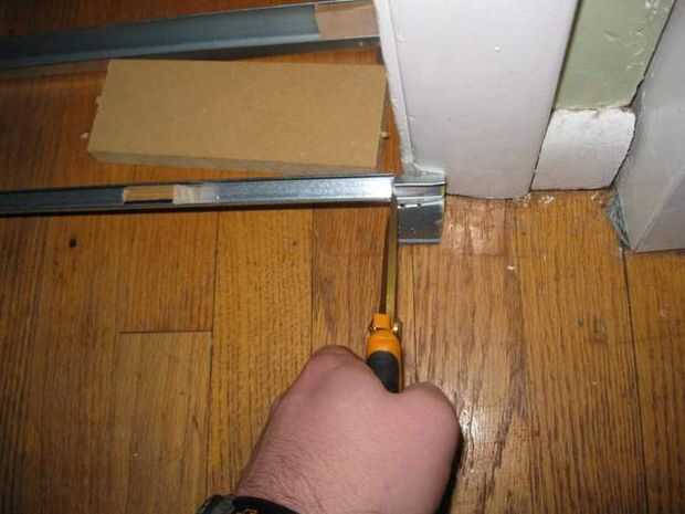 Mientras todo está todavía en el piso puede atornillar las piezas. Este conjunto puede entonces montarse en la puerta bastante fácilmente.