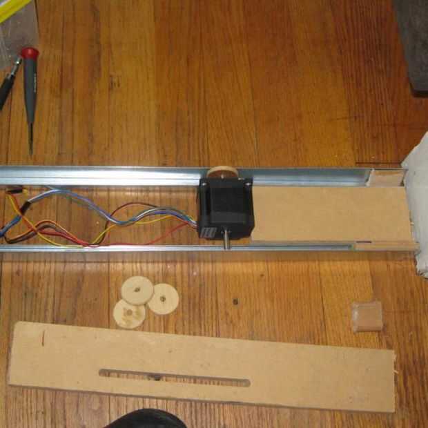 J-rail se montarán piezas de MDF. Al igual que las tiras de madera se montan en el Banco de pruebas. Puse esto hacia fuera en el piso. El motor se sentará entre los rieles, por lo que tiene que haber espacio suficiente para mantener el eje del motor de golpear la pared de la corredera. Esto hace que el conjunto ligeramente más amplia entonces el aparejo de prueba, así que he añadido unas calzas de madera.