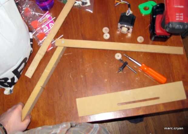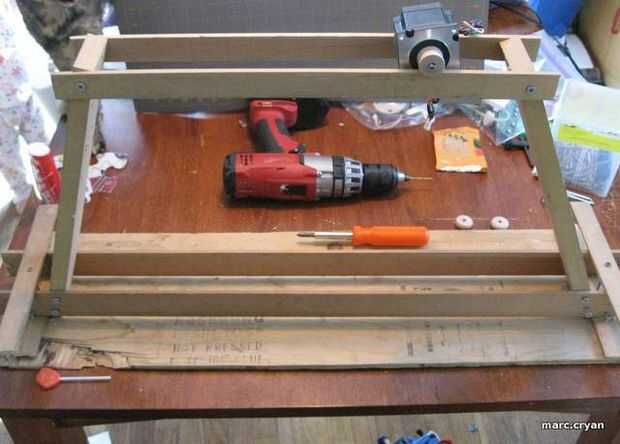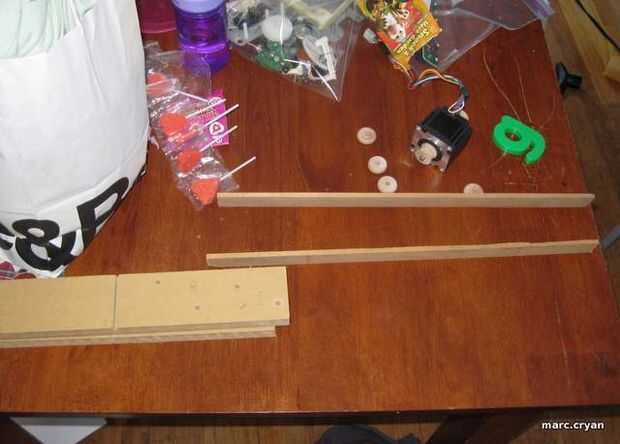 Esto está hecho de piezas de chatarra, así que no voy a entrar en mucho detalle acerca de la construcción.  La importación es que están espaciados de los dos rieles de madera que sostienen el motor paso a paso con algunas ruedas en él.