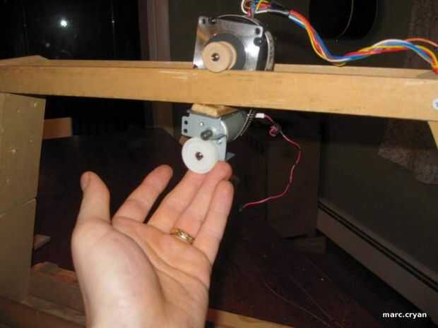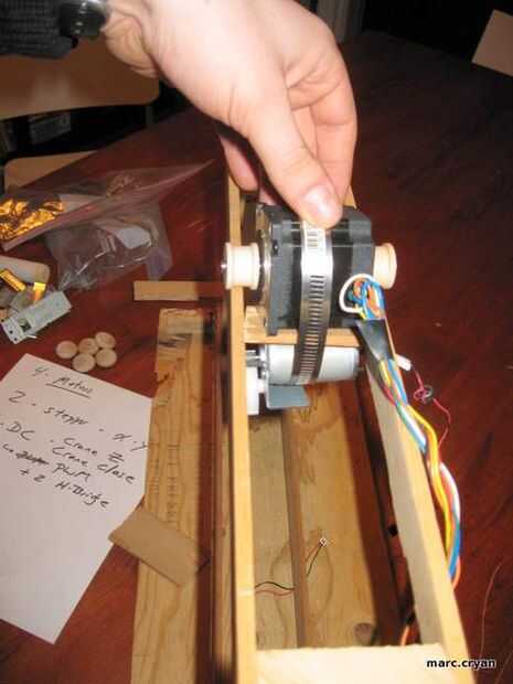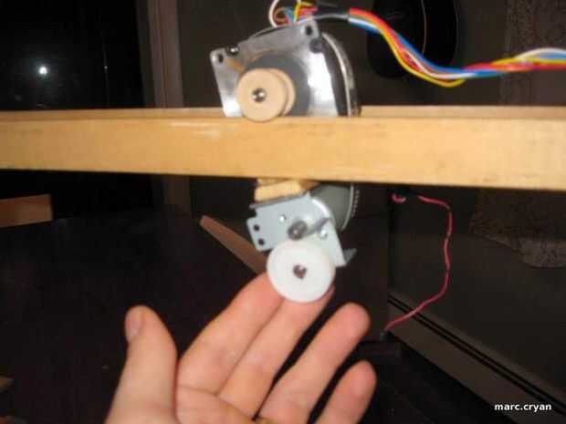 Estoy usando weels de madera pequeños que caben en el eje del motor stupper.  Usé una gran abrazadera para sujetar el motor de la C.C. a la parte inferior de los pasos.