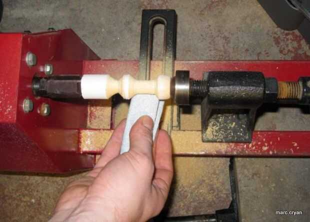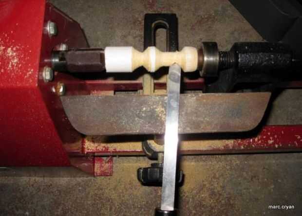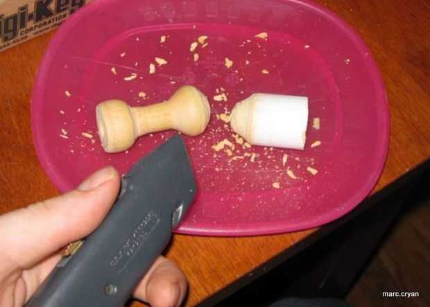 El dowl podría funcionar bien como es, pero parece que debe ser más grande en cada extremo y estrecho en el medio.  Tengo un torno de madera solía para bajar el dowl en una forma que parecía adecuada.