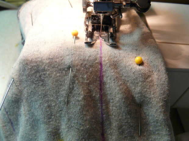 Tomar la manga a la máquina de coser y coser justo en las líneas que dibujó, con una longitud de puntada muy corta (1.5 mm) y una aguja de bola de tamaño 11. (Dependiendo de donde usted vive, la aguja también puede ser llamada tamaño 75 y puede ser referida como una aguja de "estiramiento")