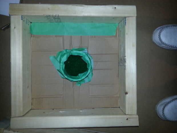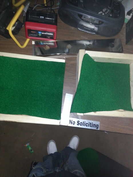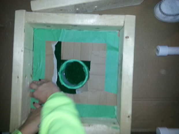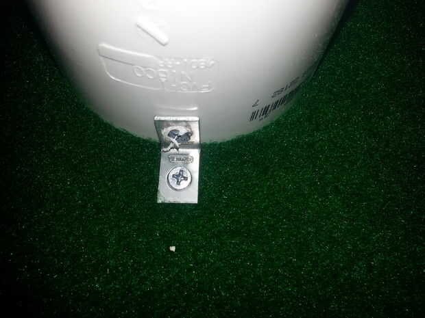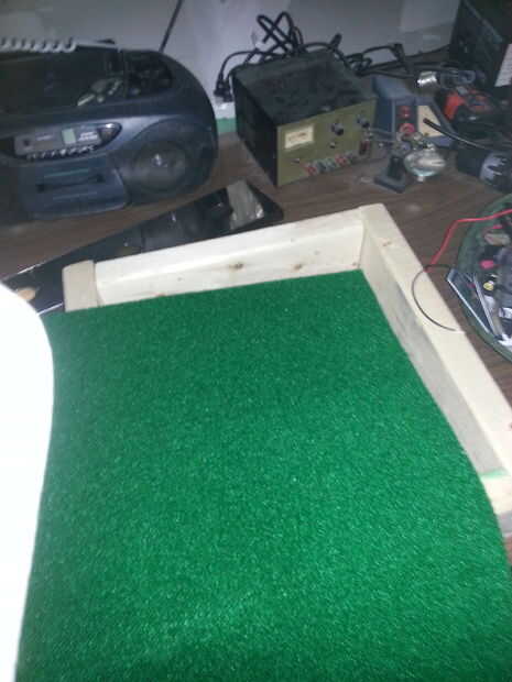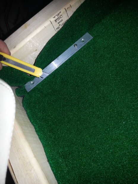 Cortar la alfombra verde al tamaño de la parte inferior del juego de arandela. Usé pegamento para fijarlo. Para fijar el pvc usé L dos soportes y atornillado el pvc hasta la parte inferior del juego de arandela