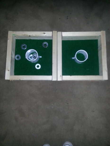 utilizar arandelas de tope de metal 5/8 de pulgada.  Tres alternando tiros por equipo.  Cajas se colocan 25 pies de distancia, centro a centro.  3 puntos para un cuadro. 5 puntos para una taza.  Puntos de opositores cancelan mutuamente.  Copa siempre