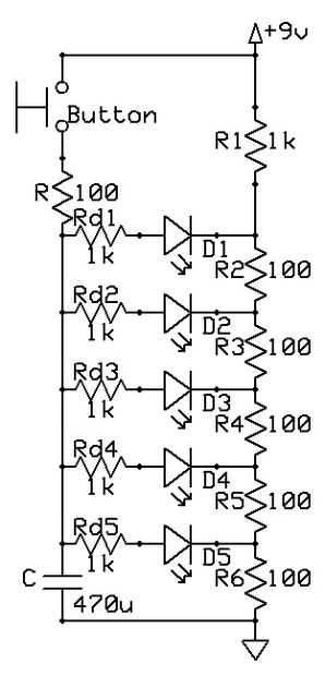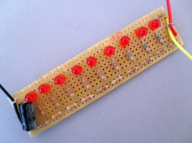 La teoría es fácil de entender. Las cargas del condensador hasta el LED lentamente. Uno por uno encienda. Más fuerte el golpe cuanto más tiempo que se presiona el botón y el LED más se enciende.