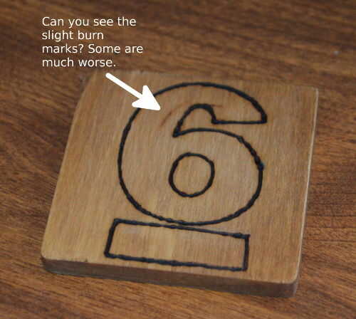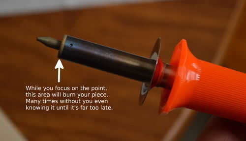 Nunca utilizar una utilidad de grabación antes, encontré que tenía que sostener la pluma más vertical porque si no lo hacía, la base donde la punta se enrosca, le toque la madera y quemarla. Si dejé incluso un rato antes de levantar el lápiz de la superficie, creé divots en la pieza.