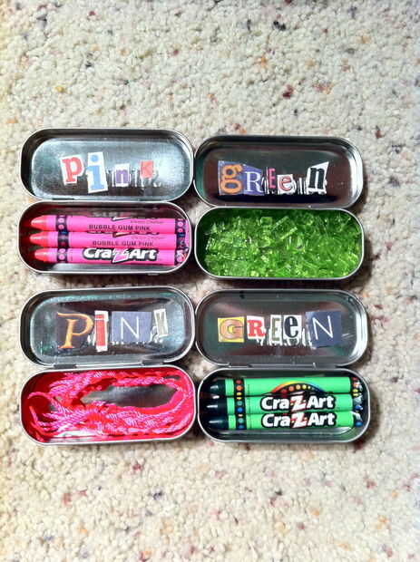 También hicimos algunos que fueron partidos de color... Cadena y lápices de colores, tanto rosa. Chips y lápices de colores, tanto verde...