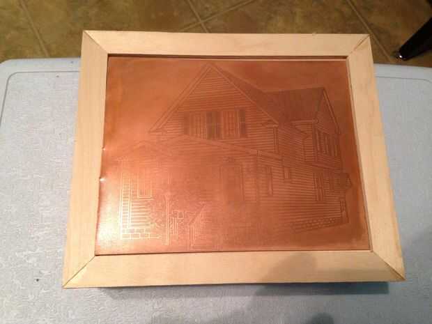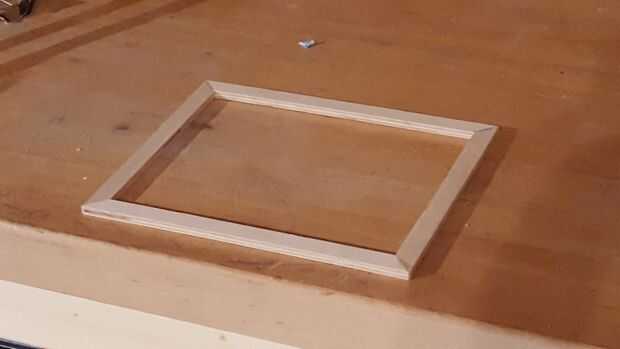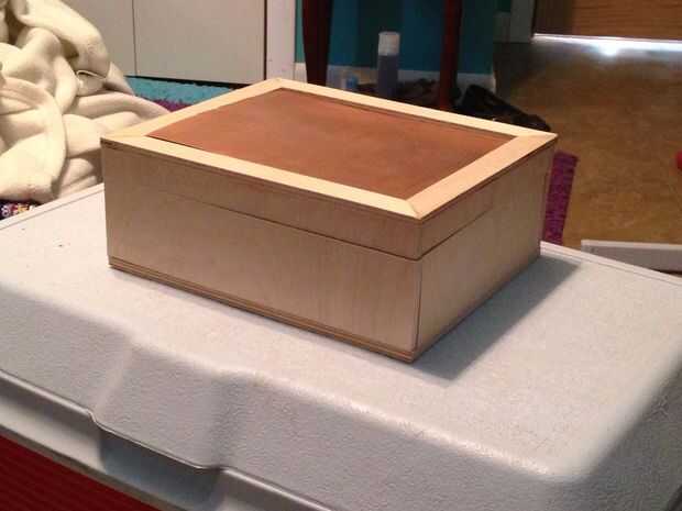 1.) hice la tapa primero por lo que encajaría la placa de cobre. I cortar tiras finas de 1/4" madera contrachapada e inglete las esquinas para hacer una especie de marco para la placa y pegan los trozos de madera. Luego corté un rectángulo de 1/4" madera contrachapada para pegar a la parte inferior de este marco. El rectángulo era una media pulgada más corta que el marco por todos lados así que las paredes de madera contrachapada de media pulgada podrían barbilla fácilmente en él. Pegué las dos piezas juntas