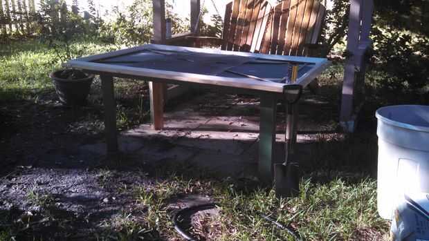 mesa de hormigón superior después y antes dePaso 1: quitar chapado madera vieja que venía de después de 2 años. uso vibrante herramientaPaso 2: Quite el viejo carril debajo, solidificar el apoyo de la mesa con 2 x 4 para soportar peso del hormigón. c
