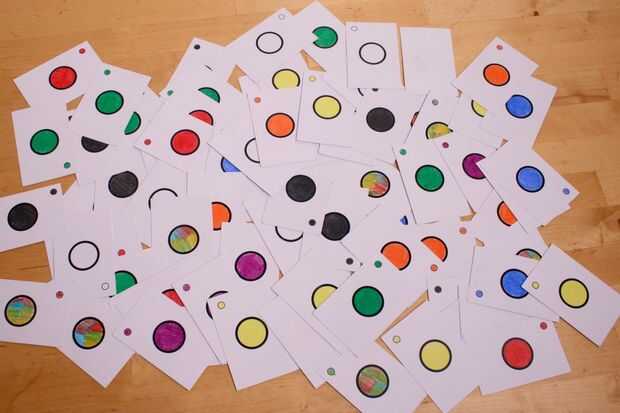Las cartas de juego principal de entrada al paseo son esencialmente tarjetas a color. He creado una plantilla muy simple en Illustrator con un gran círculo en el centro y un círculo más pequeño en la esquina, para permitir a los jugadores para ver fácilmente el color de las tarjetas en sus manos cuando aventó hacia fuera. Como no tengo acceso a una impresora de buen color, sólo utiliza lápices de colores para rellenar en cada uno de los círculos y una distribución igual de cada color. Usé un lápiz de color multicolor para el wild card.