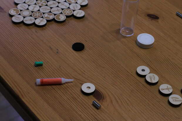Pegar los imanes en la parte posterior de cada pieza que estén en la posición correcta. Si no estás seguro, poner primero el imán en el tablero.