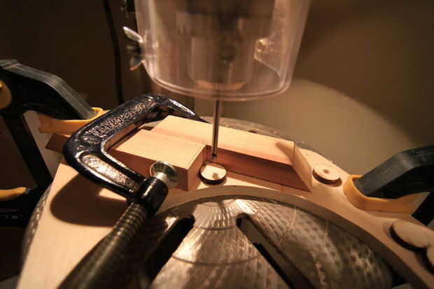 Utilizando la misma técnica como antes, utilizar un pieza Forstner de 1/4" en el taladro y poner 2 bloques de madera para perforar siempre en el centro de cada pieza.