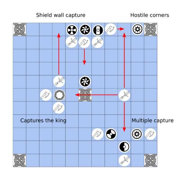 • El rey es capturado cuando rodeado de 4 atacantes o 3 atacantes y la plaza central.