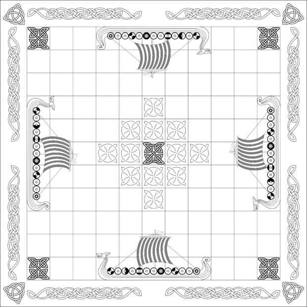He visto unos diseños donde la posición inicial de cada pieza fue marcada por un dibujo. Decidí tomar prestado la idea y dibujar un drakkar para las piezas atacantes. El defensoras trozos se colocan en los diseños celtas.