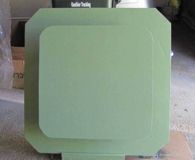 9. usar un pegamento de madera, pegamento 1/8 madera contrachapada 24 ¼" Plaza sobre tabla del nivel superior para cubrir los tornillos de acabado liso. Corte 3" radio de las cuatro esquinas del nivel superior. Bordes de arena suave.